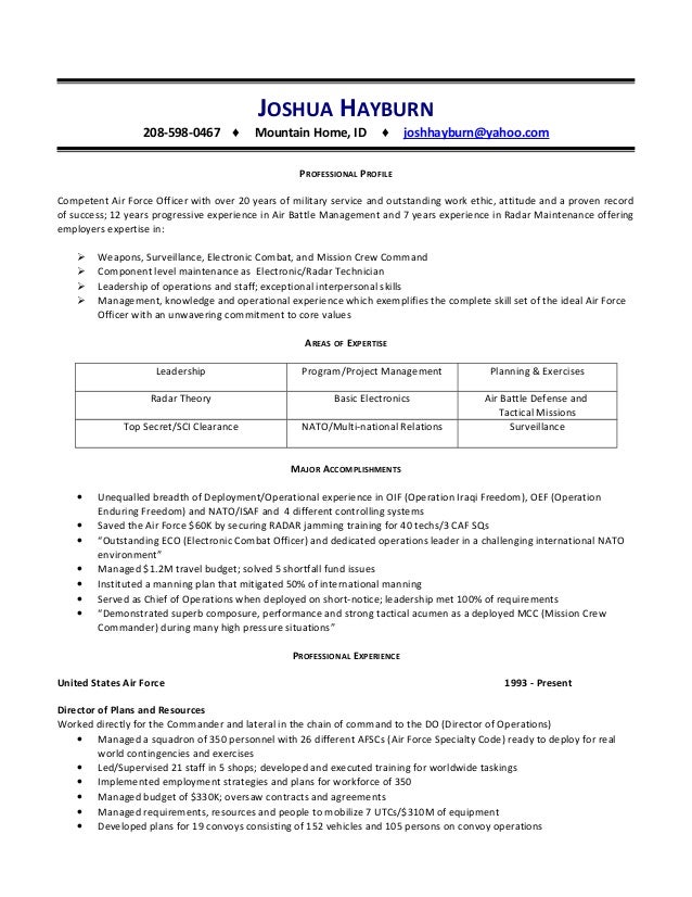 Sample Linkedin Profile Resume Military Transition Civilian. The air force employs some of the most advanced aircraft in the world to carry out various missions. Experience with foreign air force personnel, related to international assistance and cooperative programs. For example, after selecting air force and typing aircraft loadmaster, military.com showed the following jobs for candidates with an air force resume: If you're not ready to apply just yet, that's okay. Air force analyst, senior resume examples & samples. The air force recruitment process is designed to make sure you have the qualities we need, while helping you identify the ideal role. Career objective a successful air force officer seeking a position with organization needing someone with the experience, drive and ability to aid in helping the organization achieve their goals. Experience with microsoft office, including developing. Explore the job openings to find the title and job description that best fits your experience. Air force officer jobs at us air force. Air force officer september 1985 to august 2013united states air force. The air force has unprecedented growth opportunities, and any enlisted airman can take the steps necessary to work toward officer status. The officer selection board determines leadership and management potential, the ability to influence and motivate others, and the capability to learn all that. Air force officers are evaluated on their leadership potential, moral standards and academic strengths. The interview was conducted by my local recruiting station's commanding officer which in my case was a captain.