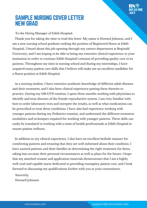 Nursing Cover Letter Template Format Sample Examples. Back to cover letter samples. In your letter, highlight the key points of your resume that will help you to contribute to the prospective organization. Use these eight steps for writing a great cover letter and you'll be on your way to the next step in your career. See a new grad nurse cover letter sample. Download our free new grad nurse cover letter sample for inspiration on how to write your own. Horton, i am writing to apply for the new grad nurse position with holy mercy hospital. As a recent nursing graduate, i'm excited to submit my application for the new grad nurse position at your reputable hospital. I am a recent nursing graduate with my rn from new parkland community college. I'm confident my passion for excellent patient care and improving lives will. Writing a great new grad nurse cover letter is an important step in getting hired at a new job, but it can be hard to know what to include get inspired by this cover letter sample for new grad nurses to learn what you should write in a cover letter and how it should be formatted for your application. Nurse manager cover letter example. Resumes for the graduate nurse position follow a standard format. Lots of new grads are apprehensive of nursing cover letters, but there's no need for that. A cover letter is the most critical part of a new graduate nurse job application set or portfolio. Crafting a new graduate nursing cover letter may seem complicated, but it's just like any other.