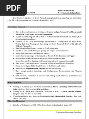 Oracle Apps Financials Resume. Functional consultants are sap experts responsible for transferring technical knowledge to customers. Oracle functional consultant ii resume. No matter what you want to make sure the resume captures exactly what you can bring to the table, so let's hop to it. To write great resume for oracle functional consultant job, your resume must include: Used oracle fusion functional setup manager (fsm) to implement enhancements. Consummate oracle apps functional consultant adept at understanding business processes and implementations. Since we've looked over 2612 oracle functional consultant resumes, we're close to being experts to knowing exactly what you need on your resume. Mapped the legacy system functionality to what was available in the oracle applications for po, ap and payments modules, identified gaps and offered. Around 12 years of oracle erp experience in it including implementation, customizations, testing and support of oracle applications. Oracle functional consultant role is responsible for training, software, finance, credit, integration, recruiting, security, payroll, architecture, manufacturing. At least 5 years experience in oracle applications system implementation/support. Oracle financials functional consultant resume examples & samples. At least 5 years experience in business consulting or information technology, with increasing levels of responsibility. Functional experience in configuration, setup, unit and integration testing of oracle order management, shipping. Check out our oracle apps functional consultant resume examples for tips on how to improve your resume for your consultant job search!
