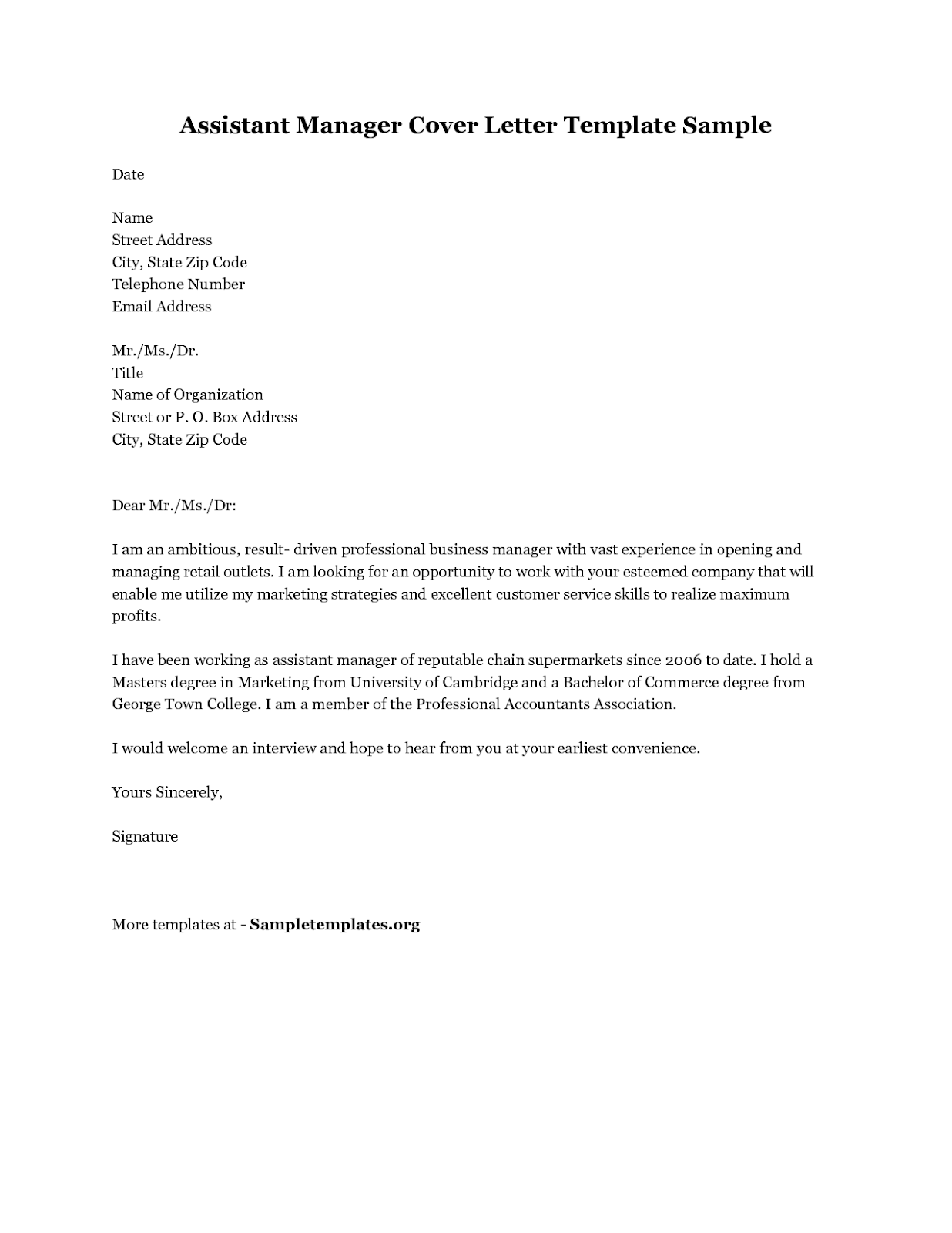 Assistant Store Manager Cover Letter Sample Cover Letter Templates Examples . Home » Templates » Letter Samples » Cover Letters Misc » Retail Store Manager.
